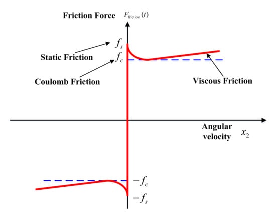 The Stribeck friction curve is a well-known model of the friction. It shows the relationship between the friction force and angular velocity for different values of the friction. A friction model can be expressed as in Equation (4). When the static friction is |θ ˙(t)| < α, with threshold, the dynamic friction can be given by (4). One can see that the static friction is |θ ˙(t)| > α, and can be given as above in which Fs denotes the driving force, Fc represents the maximum static friction force, and it is a small scaling factor.