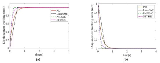 We chose the step signal as a reference to simulate the displacement of the PMLM, and the load is set to = 0 N. The step response of NFTSMC, LSMC, PID, and our proposed PreDSMC control is shown in Figure 3a, and the respective error curve is given in Figure 3b. The predefined time for our proposed controller is set to 0.5 s. The convergence of PID, LSMC, and NFTSMC is very slow as compared to our proposed PreDSMC. Owing to the steady state error, the convergence time of the other three controllers is about 1 s. Thus, the proposed control strategy has a good convergence time, which is settled before 0.5 s. The error tracking results in Figure 3b depict that our proposed control strategy has a good convergence as compared to NFTSMC, LSMC, and PID control.