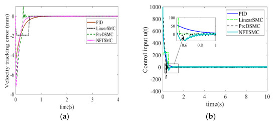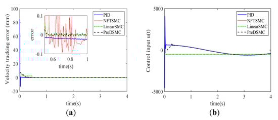 (a) Comparison of sinusoid velocity tracking error displacement for all controllers. (b) Control input for different control algorithms.