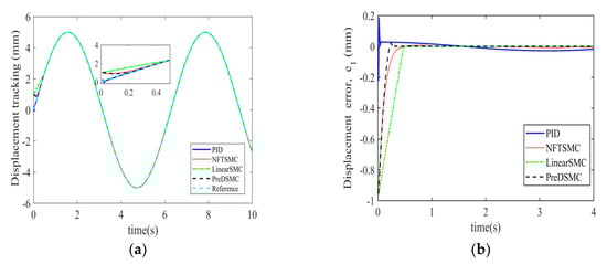 A sinusoidal displacement signal is taken as a reference, i.e., , with an amplitude of 5 mm and frequency of rad/s. Like the previous case of step response, is taken as 0 N. In the same manner, the predefined settling time PreDSMC in the sinusoidal case for the proposed controller is set to Ts = 0.5 s. It means we want the controller to settle before 0.5 s. It can be clearly observed from Figure 5a that our proposed controller convergence is very fast as compared to PID, LSMC, and NFTSMC. Moreover, the tracking accuracy of PreDSMC in the case of predefined time control is very high. The respective steady state error of the four controllers can be seen in Figure 5b. The steady state error in the case of PID is very large, about −0.3 to 0.3 mm, while for LSMC and NFTSMC it is almost −0.2 to 0.2 mm. Our proposed controller has a steady state error of almost 0.01 mm. It depicts that our proposed PreDSMC is more robust as compared to the simple PID, LSMC, and NFTSMC.