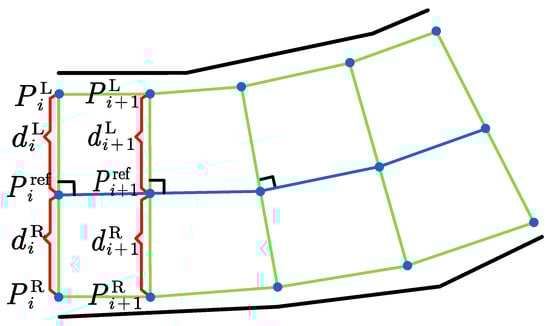 Generally, the given reference path is safe and reliable. It is desirable that the optimized path keeps the shape of the reference path. For this, the sum of deviation between optimized points and reference points along the path is considered to minimize the deviation. As previously noted, the reference path points are taken as the middle points of the corridor to generate corridor boundaries. A reference path point in the corridor is represented as . The cost function of reference path deviation is measured as: