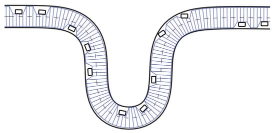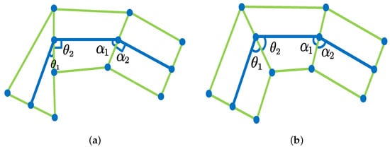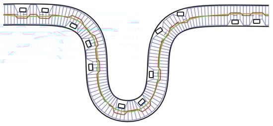 Algorithm 1 shows the process of the proposed spatial corridor generation. The algorithm will begin with a linear interpolation for generating a path with uniformly and densely distributed waypoints, if there is a path with the sparse path point distribution. Then, we compute the segment line slope (Line 4 in Algorithm 1) and its vertical line slope (Line 5 in Algorithm 1) for extracting spatial corridor. There are n vertical line slope parameters computed in Algorithm 1 from line 3 to line 10. It is worth noting that the function (Line 11 in Algorithm 1) is introduced to reconstruct the local segment of the corridor so that a reasonable corridor along path can be obtained. An example for local corridor reconstruction is shown in Figure 2. Based on the final slope set , boundary points are computed (Line 12–17 in Algorithm 1).