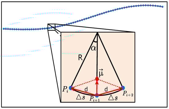 Curvature constraints play an important role in guaranteeing the feasibility of the path kinematically. is defined as the minimum turning radius, which is given by the vehicle’s physical restrictions. The maximal curvature can be represented as . The following descriptions are based on an assumption that each path point is uniformly and densely distributed over the path. Thus, with the illustration in Figure 3, several approximate formulas are obtained as follows: