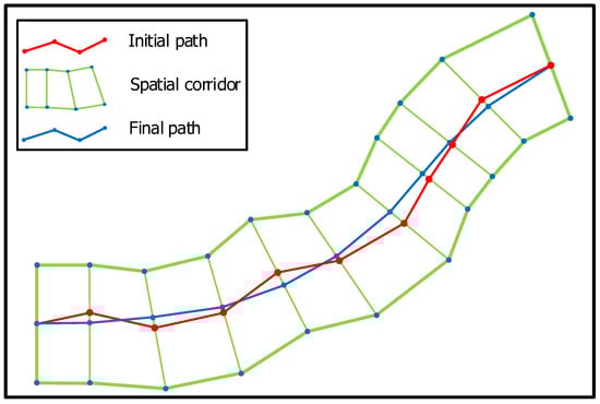 An illustration of the results of path optimization. Spatial corridor and high quality path are generated after optimization. The spatial corridor is directly constructed by the initial path. After optimization, a path is obtained within the region of the spatial corridor. The quality of resulting path (the blue line) is higher than the one before (the red line).