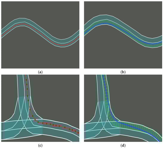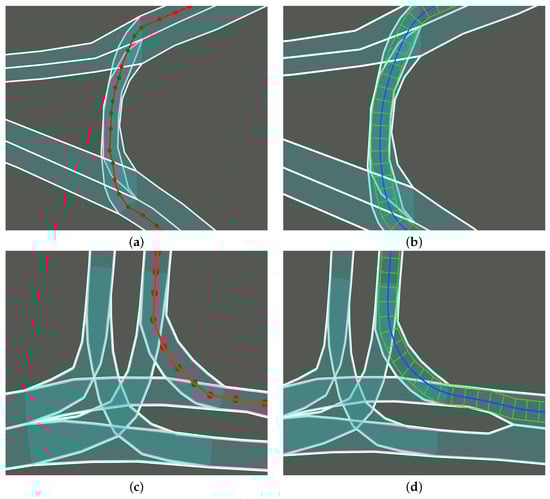 In the autonomous driving scene, a high quality reference path is desirable to be provided for self-driving, which primarily fulfills requirements of safety, smoothness and following the initial path as much as possible. The requirement of the shortest path is considered as the secondary goal. Different road conditions including the straight line and turning curve are tested, as shown in Figure 6. Reference paths in Figure 6a,c are given by the global planner module. The points along the reference path are distributed unevenly. These paths are hard to be executed directly, due to having impracticable curvature. After optimization, resulting paths in Figure 6b,d are high quality paths adjusted in several aspects, including smoothness, curvature, deviation and length of the path.