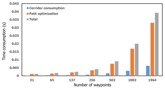 Figure 11 shows the average time consumption of each part of the proposed algorithm. Paths with different lengths are adopted to test the efficiency of our proposed method. A path with more than 1900 waypoints can be optimized completely in less than 40 ms, which shows that the proposed algorithm is able to run in real-time.