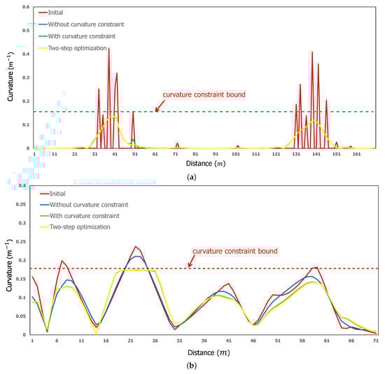 In order to prove capabilities of the proposed algorithm to generate a both smooth and kinematically feasible path, we first make a comparison among following three cases: (i) path optimization only with boundary constraint. (ii) Path optimization with boundary constraint and curvature constraint. (iii) Two-steps path optimization with boundary constraint and alternative curvature constraint (showed in Algorithm 2). In Figure 12, the curvature distribution of the initial path surpasses the permissible maximum curvature, as shown in the red curve. In Figure 12b, the optimization result of case (i) violates the maximum curvature constraint, while results of case (ii) and case (iii) satisfy the maximum curvature constraint. In Figure 12a, all the cases can generate a feasible path satisfying the miximal curvature constraint.