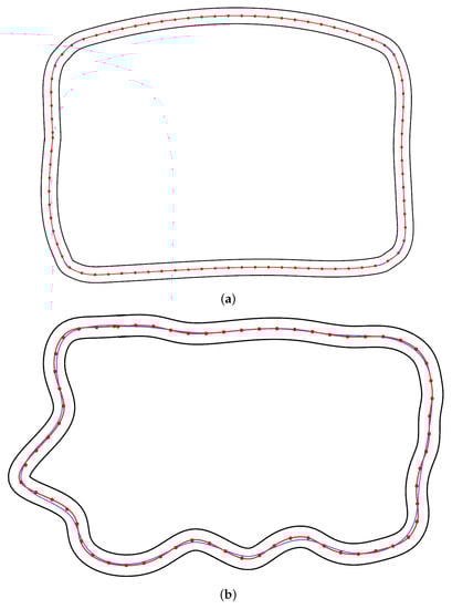To sum up, the optimization objectives presented in Equations (9), (14), (15) and (18) are quadratic functions (). Boundary constraints in Equation (20) are formulated as affine equalities (). Both corridor internal constraints in Equation (21) and corridor boundary constraints in Equation (34) have the form of affine inequality (). Therefore, the overall path optimization problem can be described as a general QP problem:
