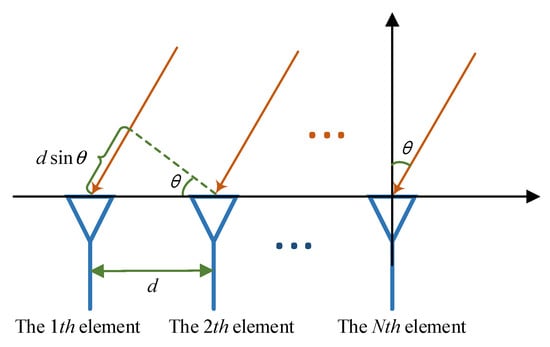 In this paper, the single snapshot scenario is considered []. As shown in Figure 1, we consider a uniform line array (ULA) with N elements in the narrow-band mode. It is assumed that there are K far-field sources from ,  indicates the direction of the kth source, and the received signal can be formulated as