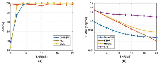 Since the DNN-SW can estimate the number and directions of sources simultaneously, in this simulation, the two values are unknown, and both need to be obtained. To further evaluate the proposed method, the comparison methods are applied. The existing methods can rarely achieve the two tasks at the same time. Therefore, the whole task is divided into the source number estimation part and the DOA estimation part for the comparison methods. In the source number estimation part, two conventional methods are employed for comparison, including AIC and MDL [,,,,]. Then, in the DOA estimation part, FFT, MUSIC, and ESPRIT are utilized. Furthermore, since MUSIC and ESPRIT are based on the covariance matrix, the space smoothing algorithm is applied to generate the covariance matrix before estimation [].