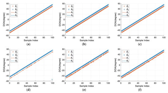 Firstly, we change the directions of the two sources to assess the DOA estimation performance. The first source  varies from −49.59° to 49.41° with the step of 1°, and the direction of the second source  is set to . The directions of the sources are all off-grid. When the SNR of the two sources is both 10 dB, the estimation results of DCN and DNN-SW are shown in Figure 7a, b, and c, respectively. We can observe that the three deep learning methods can achieve satisfying performance in the ideal case. Figure 7d–f depicts the results when the SNRs of two sources are 10 dB and 18 dB, respectively. The results demonstrate that ΔSNR between two sources severely degrades the performance of DCN; the source with lower SNR is rarely estimated. By contrast, DNN-SW can significantly alleviate the problem due to the design of the sub-region network structure. The lower SNR source is estimated in its sub-region, and the influence of the other sources can be reduced. In addition, compared with DNN-NSW, we can infer that the sliding window can improve the accuracy of estimating the number of sources and the performance of DOA estimation.