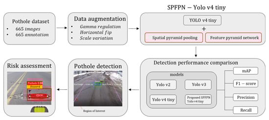 The remainder of this paper is organized as follows: Section 2 presents a study of detection algorithms and risk assessment associated with potholes. Section 3 presents the data preprocessing, SPFPN-YOLOv4 tiny, and the risk assessment algorithm applied in this study. Section 4 presents the results of the object detection performance comparison and the validation of the risk assessment algorithm. Section 5 presents conclusions, limitations, and future research objectives.