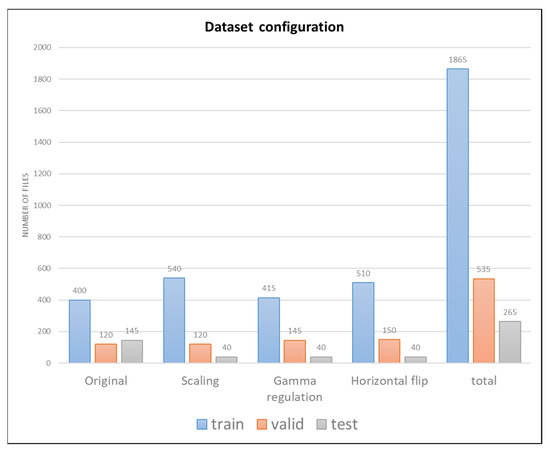As shown in Figure 3, the total number of datasets after data augmentation was applied was 2665, divided into 1865, 535, and 265 images for the training, validation, and test data, respectively. Subsequently, additional dataset splits were performed. In order to prevent the deep learning model from overfitting to the original data set, it was first distributed to 60%, 20%, and 20%, respectively, then redistributed to 60%, 18%, and 22%, respectively, by moving a small amount of data. Additionally, for improving model’s detection accuracy under challenging condition, different ratios were applied to the data set to which the data augmentation method was applied and divided into training, validation, and test data, as shown in Figure 3. The scaling-applied dataset is a data augmentation method to train small potholes well, divided into 540, 120, and 40 data for the train, valid, and test datasets. The Gamma regulation-applied dataset is a method for precisely detecting potholes in a noisy environment, divided into 415, 145, and 40 data for the train, valid, and test datasets. The Horizontal flip-applied dataset is intended to compensate for the deficient dataset, divided into 510, 150, and 40 data for the train, valid, and test datasets. Since the data augmentation-applied dataset was applied to improve the detection performance of the model under an adverse environment and prevent overfitting, it was allocated to 40 sheets for the test dataset.