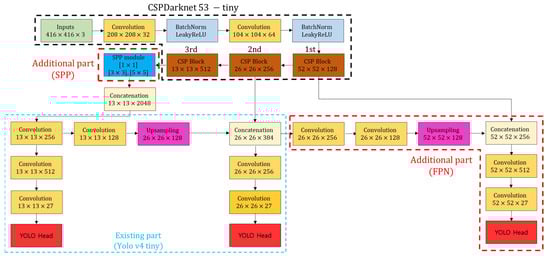 YOLOv4 tiny detects objects based on CSPDarknet53-tiny, which applies CSPNet [41] and one FPN, which is a type of multi-scale network [27]. Figure 4 shows the overall structure of the SPFPN-YOLOv4 developed in this study. The black dotted line is CSPDarknet53-tiny which is the backbone of YOLOv4 and consists of three CSP blocks and two convolutional layers. The area marked by the blue dotted line represents the original YOLOv4 tiny head, and the object is finally detected in a feature map with sizes of 13 × 13 and 26 × 26. The FPN consisting of an upsampling layer, and a convolutional layer was used to connect the 13 × 13 feature maps and 26 × 26 feature maps.