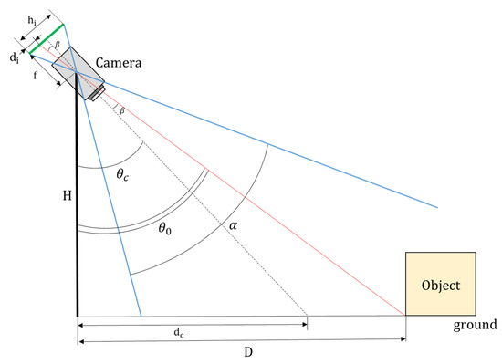 where H is the height from the ground to the camera lens; is the angle of inclination from the vertical axis pixel height of the image; is the angle from the camera to the detected pothole; and is the angle from the vertical axis to the pothole. can be calculated by following Equation (10):