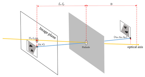 Figure 6 illustrates the principle of the pinhole camera and shows the image plane projected through the pinhole of the lens. The pinhole is a simplified camera model that projects an external image onto an image plane and considers image pixels and absolute coordinates. In Figure 6, the axis passing through the hole of the lens is called the optical axis, and the distance from the hole to the location where the image on the back is formed is called the focal length. The focal length calibrated for each of the x- and y-axes of the camera lens are called the x-axis focal length () and y-axis focal length (), respectively. The central point in the image plane on which the image is projected is called the principal point (). The pinhole camera parameters are expressed as a camera matrix in Equation (14):