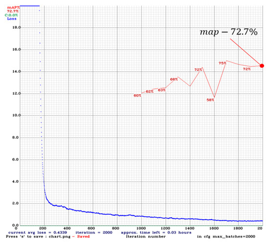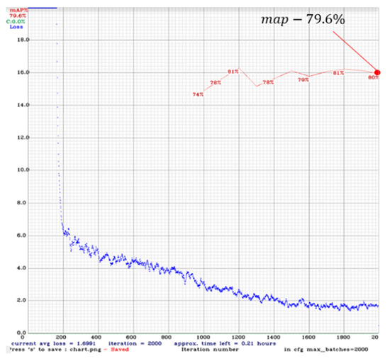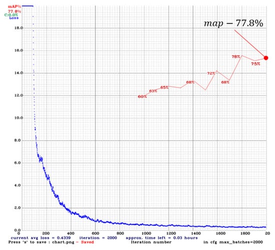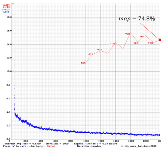 Figure 7, Figure 8, Figure 9 and Figure 10 shows the mAP(IoU = 0.5) of YOLOv2, YOLOv3, YOLOv4 tiny, and the proposed SPFPN-YOLOv4 tiny and training hours during the training phase. The blue line in each figure indicates the loss, and the red line indicates the recorded mAP(IoU = 0.5) per 100 times from 1000 iterations. Figure 7 of YOLOv2 shows a rapidly converging loss from approximately 20 times, and shows that it achieves 74.8% mAP(IoU = 0.5) with a convergence of 1 after the training. Figure 8 of YOLOv3 shows a stable convergence pattern after 600 iterations and achieves 77.8% mAP(IoU = 0.5) with a convergence of almost zero at the 2000 iterations. Figure 9 of YOLOv4 tiny shows a stable loss pattern and converges to almost zero at 2000 iterations. Figure 7 of the proposed SPFPN-YOLOv4 tiny shows an irregular loss pattern compared to other YOLO models but achieves the highest mAP(IoU = 0.5). The training epochs of each model were set to 2000, and additional detection performance comparisons, such as precision, recall, F1-score, and FPS, were performed at the end of training.