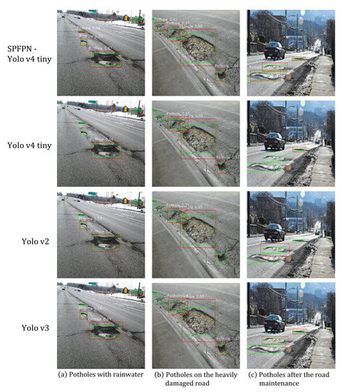 Figure 11 shows an example of the results for the test dataset of the proposed SPFPN-YOLOv4 tiny, YOLOv4 tiny, YOLOv2, and YOLOv3. The green rectangle is the ground truth, and red is the prediction bounding box predicted by each YOLO model. The ground truths presented in pictures (a), (b), and (c) are 3, 5, and 3, respectively. In the image (a), SPFPN-YOLOv4 tiny successfully detected all three potholes, YOLOv4 tiny detected one pothole, and YOLOv2 and YOLOv3 detected two potholes. In the image (b), SPFPN-YOLOv4 tiny, YOLOv4 tiny, YOLOv2, and YOLOv3 detect four, three, two, and three potholes, respectively. In the image (C), SPFPN-YOLOv4 tiny detected all three potholes, YOLOv4 tiny and YOLOv2 detected only one pothole, and YOLOv3 detected two potholes. The values for the IoU score achieved by each YOLO model for pictures (a), (b), and (c) are summarized in Table 7.