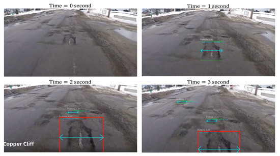 These variables can be measured by attaching a camera to the vehicle. However, the variables were arbitrarily set to verify the validity of this study. Moreover, it is desirable to measure the tire contact patch size for comparison with a pothole; this study replaced it with the tire footprint value used in other studies to verify its validity. The size of the tire contact patch is defined as when the air pressure is 1.2 bar, and the weight under the axis load is 4383 N. Based on these values, the width and height of the tire contact patch were compared with those of the pothole width and height. It is defined as dangerous when the size of the pothole is 1.2 times larger than the tire patch size, cautious when the two values are the same, and safe when the pothole size is smaller than the tire contact patch size. Figure 13 shows the process of determining the risk using a pothole-report video. After detecting the pothole, the width and height values of the bounding box are calculated and compared with the predefined tire contact patch value so that the safety case can be checked in green and the dangerous case in red.