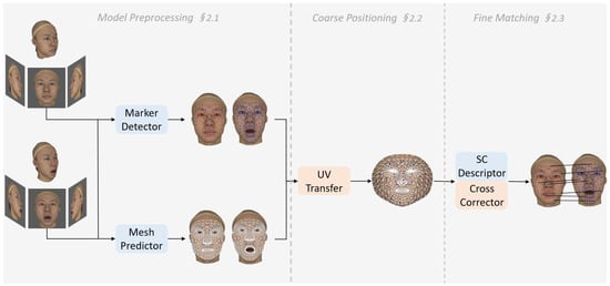 However, the face model reconstructed using this method always contains a large number of vertices, which is computationally intensive, making it difficult to perform subsequent steps such as bone binding and animation driving [19]. Therefore, an appropriate topology needs to be rebuilt for it. Moreover, in order to make the digital avatar more realistic, it is necessary to scan various expressions of the target actor as a reference, and these expressive models need to maintain a consistent topology [20]. A connection must be established, which can be used to warp an ideal model to each scan to ensure topology consistency [19]. In this process, optimization usually relies on art modelers manually labeling hundreds of corresponding feature points for each scan. Due to the heavy workload, in the current asset generation, the completed rig of a character that includes different expressions takes a long time to finalize [21,22]. It is especially important to automatically find the correspondence between deformable models in demand, which is also the focus of the paper.