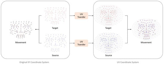 In this paper, even though the mesh provided by the MediaPipe tool is pseudo-3D [35,36,37], we can still use this mapping idea to establish the mapping principle between the original image space and the 2D texture space. Based on this principle, we can realize the conversion between the original XY coordinate system and the UV coordinate system.