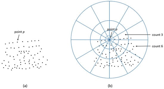 A scheme of representation of point sets using SC. (a) A point set of 78 points. (b) The SC feature diagram of point p.