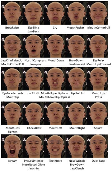We scanned one male subject and one female subject with a Light Stage system [39] to build the dataset. Before capturing, we drew some small black markers on the subjects’ faces as a reference for the subsequent experiment. The markers were evenly distributed in different parts of the face. Subjects were asked to keep the back of the head and neck as still as possible, so that we could obtain complete pictures of expressive faces from a unified viewpoint. Each subject presented a neutral face and 25 expressions [40] (as shown in Figure 7), including some extreme expressions (e.g., screaming or crying), asymmetrical deformations (e.g., mouth to the left or right) and subtle motions (e.g., lip tightening or eye blinking). To simplify the process, after scanning, we rendered the scan model with a fixed frontal viewpoint to obtain 2D images. The following matching experiments were based only on the single view of expressive images, which covered as much of the facial area as possible. Each capture of an expression contained a set of 100 facial markers, among which those from neutral faces were set as target points and those from other expressions were set as source points. In conclusion, we prepared 50 sets of points as data for the following experiments.