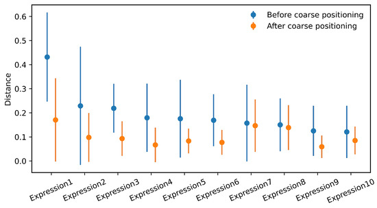 In order to verify the effectiveness of the SC-UV method proposed in the coarse positioning stage for face deformations, we recorded the Euclidean distance between 100 pairs of points for each expression in our dataset relative to the neutral expression (being relaxed). After that, we selected the top 10 expressions based on the average of the distances to study the effect of the coarse positioning step on expressions with larger movements. As the width of the eyes changes very little when the face moves, we normalized the distance recorded according to the width of eye contour covered by the mesh. The average and standard deviation are shown in Figure 8, representing the moving degree of facial points when the neutral expression changes to others.