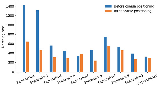 It is worth noting that for Expression 1 (screaming), the higher average distance indicates that this expression has greater facial movement overall. The large standard deviation does not mean that the data were inaccurate, but reflects the uneven movement of different parts of the face (less regarding the eye corners and more in terms of the mouth). We also calculated the total matching cost for each expression according to Equation (8), which is shown in Figure 9, indicating the shape differences.