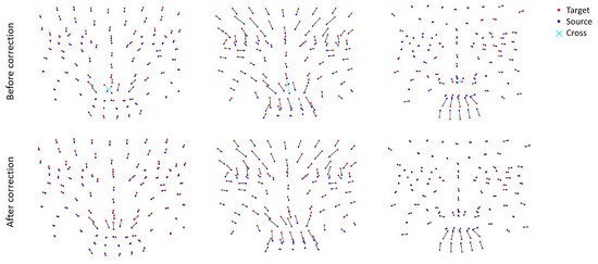 We also validated the availability of the SC-AC method proposed in the fine matching stage with the same dataset. Some cases are shown in Figure 10 to illustrate that the additional correction contributed to the results. To be specific, the above three cases represent the optimal solution for matching based on traditional SC features using the Munkres algorithm [38]. There are several regional crosses, highlighted in cyan in Figure 10. The results of re-checking and matching based on additional correction are shown in the last row, where all the estimated correspondences are in accordance with the rules of facial movement and structural features.