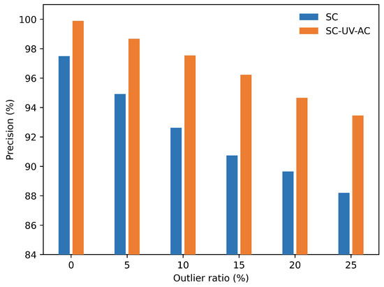 Figure 11 shows the results of our method with different outlier ratios. We repeated the test three times in each experimental condition to take the average as the final score. For different outlier ratios, the precision rate of our method was improved over the original SC matching algorithm, and it achieved more than 93% even with 25% of outliers, demonstrating more accurate and stable matching performance.