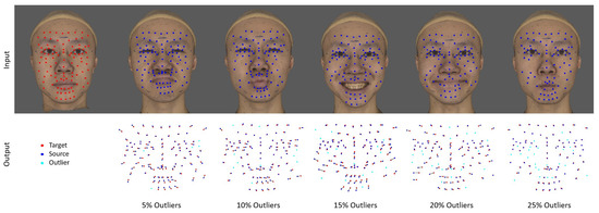 Some cases with outliers that preliminarily simulate occlusion in face deformation are shown in Figure 12. The inputs are the point sets of a neutral expression and five other expressions, which have five different outlier ratios. The outputs are the results of the calculated correspondences between them. The black lines connect the pairs of red and blue dots. The cyan dots represent the outliers estimated by the algorithm.