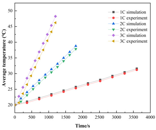 To verify the accuracy of the battery model, the temperature rise experiment was conducted. Two PT100 temperature sensors were mounted on the side faces of the battery as shown in Figure 1. The battery temperature during the discharging process at 1 C, 2 C, and 3 C is assumed as the average value of the two sensors. Figure 2 shows the simulation and experiment results; it can be seen that the temperature rising rate and the maximum temperature increase obviously with the increase in the discharging rate. In addition, the simulation temperature is a little higher than that in the experiment because the heat exchange between the battery and ambient air cannot be avoided completely in the experiment like the setup in the simulation. The maximum temperature difference between the simulation and experiment is 0.38 °C, 0.95 °C, and 2.08 °C at 1 C, 2 C, and 3 C, respectively. The error is less than 4%, indicating that the model is accurate. In addition, the heating generation power is calculated according to Equation (4) based on the experimental results, as shown in Table 2.