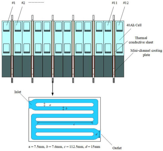 In practice, battery packs usually contain batteries, heat dissipation components, mechanical components, and control modules. However, the heat exchange mainly occurs between the heat dissipation components and the battery, and the influence of the remaining components is small. In order to optimize the computational performance, a battery module model consisting of 12 batteries and 6 mini-channel liquid cooling plates was built for analysis in this study, as shown in Figure 3. The batteries are numbered from 1 to 12. In addition, thermal conductive sheets are set between adjective batteries and mini-channel liquid cooling plates to decrease the contact thermal resistance. The thickness is 2 mm and the thermal conductivity is 2 W × K−1 × m−1. In the primary design, 2 parallel 3 tandem flow channels are used; the width is 7.6 mm and the height is 2 mm for one flow channel. In addition, the material of the plate is set as aluminum in all the simulations, and the properties are the defaults in the software. The other structural parameters are shown in Figure 3 as well.