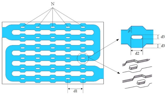 In practical engineering applications, adding disturbance design to change the original velocity field of the fluid to make a sudden change in the flow direction and produce secondary flow, or adding fins, manifolds, and other microstructures on the flow channel to change the fluid boundary layer and flow state, can improve the heat dissipation performance without generating additional energy consumption. In this paper, the disturbance structure is applied to the design of the mini-channel liquid cooling plate, as shown in Figure 4. The structure parameters include the number of the disturbance structure within a single channel N, the spacing between two adjacent disturbance structures d1, the length of one disturbance structure d2, the width of one disturbance structure as well as the depth of the cavity d3, and the tilt angle of the cavity β.