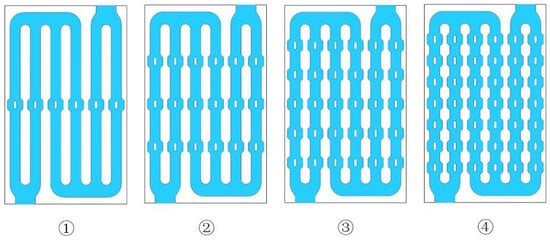 Compared to the above several cooling ways, liquid cooling has many advantages, such as high heat dissipation performance, high engineering applicability, and high energy density [26]. By adding tubes or cooling plates around the batteries, the coolant is driven by pumps and flows along the paths to dissipate the heat [27,28]. In addition, another form of liquid cooling is submerging the batteries directly in the coolant, and this way can significantly improve power consumption and temperature uniformity [29,30]. However, direct liquid cooling needs complex sealing structures, and its reliability is hard to maintain in real applications. Therefore, much attention is paid to indirect liquid cooling. Zhou et al. [31] designed a cold plate with half-helical ducts and compared its performance with the jacket liquid cooling. Results show that half-helical ducts are more efficient. Rao et al. [32] proposed a novel form of liquid cooling in which the contact surface is variable. Results show that the maximum temperature of the battery can be efficiently controlled under 40 °C. Shang et al. [33] proposed a novel liquid-cooled BTMS with changing contact surface to improve the heat dissipation performance. Results show that the battery temperature is proportional to the inlet temperature. Under the requirement of the increased energy density of the battery system, more attention has been paid to liquid cooling plates with mini-channels due to their tight size, high heat transfer efficiency, and low weight [34,35]. S. Panchala et al. [36,37] developed a new CFD model to research the heat flow field of a mini-channel liquid cooling plate; they investigated the temperature and velocity distribution of liquid-cooled LiFePO4 thermal management and revealed that increasing the battery charge–discharge rate will cause the battery temperature to rise rapidly. Huang et al. [38] applied the streamlined concept to the design of the micro-channels, and they found that the streamlined structure can reduce flow resistance and strengthen heat dissipation. Liu et al. [39] researched the effect of different types of coolant on the cooling efficiency of a micro-channel liquid cooling plate, and the results showed that water achieved the best cooling effect; then, nanofluids were added to the water, and the authors found that nanoparticle addition can relieve the temperature rise of the battery. According to the existing research, improving the flow field of the mini-channel is an effective way, but most research focuses on the channel shape design. Improving the flow state within the original channel is still an effective way. Contributions of this paper can be shown in the following aspects: