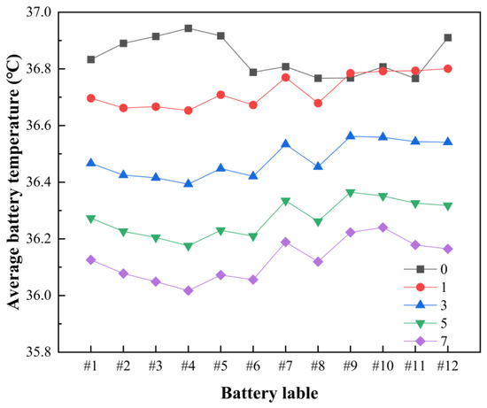 The average temperature distribution of the 12 batteries in the module at a 3 C discharge rate is shown in Figure 7. The average temperature of each battery decreases after disturbance structures are added to the mini-channel, and the decreasing trend increases when the disturbance structure number increases. When there are seven disturbance structures, the highest battery temperature is 36.18 °C, which is 0.63 °C lower than the initial plan, and the most obvious improvement in heat dissipation is achieved at this time. In addition, the addition of disturbance structures obviously changes the average temperature distribution of the batteries in the module. In the initial plan (no disturbance structure), the highest temperature occurs at the #4 battery, and the module temperature distribution shows the pattern of the temperature of the front batteries being higher than that of the back batteries. However, the temperature difference trend decreases a little when disturbance structures are added, and the temperature of all batteries decreases obviously when the number increases.