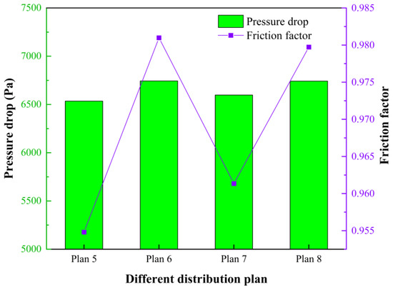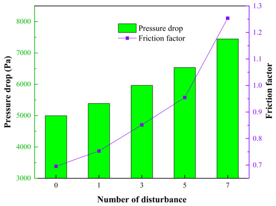 In addition to the average temperature of each battery, the maximum temperature of each battery is also monitored in the simulation. Figure 8 shows the maximum temperature and temperature difference of the battery module under different numbers of disturbances. With the addition of the disturbance structure, the maximum temperature and temperature difference both show a significant decrease compared to the initial plan. The lowest value appears when there are seven disturbance structures: the maximum temperature is 39.51 °C and the maximum temperature difference is 11.38 °C. Compared to the initial plan, the two values decrease by 0.75 °C and 0.41 °C, respectively. The phenomenon indicates that the flow field inside the mini-channel changes and the heat transfer is enhanced obviously, which further improves the temperature rise and uniformity. Figure 9 shows the effect of different numbers of disturbance structures on the performance of the flow channel. It can be seen that disturbance structures increase the pressure drop and friction factor. The increase is small when the number of the disturbance structures increases from zero to five, but when the number of disturbance structures increases from five to seven, the pressure drop and friction factor are 7445.76 Pa and 1.25, which increase 14% and 31%, respectively, which indicates that the energy consumption is obvious. Considering the heat dissipation performance and energy consumption, plan 3 (five disturbance structures in the mini-channel) is adopted in the following analysis.