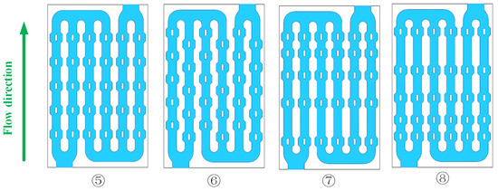 Different distributions of the disturbance structures within the flow channel also affect the flow field of the coolant, which may improve the heat dissipation and the flow channel performance. Based on plan 3, four different distribution plans, numbered 5 to 8, are designed as shown in Figure 10. Plan 5 means the uniform distribution, plan 6 means the interlaced distribution, plan 7 means the gradually thinning distribution, and plan 8 means the gradually denser distribution. The structure parameters of the disturbance structure are the same as the initial value, and the simulation condition is still under the 3 C discharging rate.