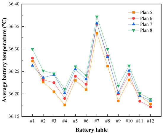 The effect of different distributions of the disturbance structures in the mini-channel on the average temperature of each battery is shown in Figure 11. The average temperature distribution of each battery is basically the same in the four plans, in which the average temperature of each battery is almost the lowest in plan 5 and is the highest in plan 8, which indicates the best and worst heat dissipation performance. In plan 5, the average temperature of battery #7 is the highest at 36.33 °C, and that of battery #4 is the lowest at 36.17 °C. The maximum average temperature difference is 0.16 °C, which indicates that the thermal balance performance is significant.