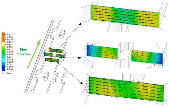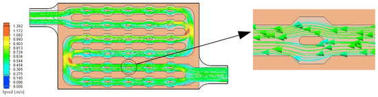 The coolant flow traces inside the mini-channel in the form of uniform distribution in plan 5 are shown in Figure 14. The coolant flow rate is relatively evenly distributed, with an average flow rate of about 0.8 m/s. As can be seen from the figure, the existence of the disturbance structure changes the original uniform flow field distribution. The flow velocity is relatively stable before the disturbance structure. However, after flowing through the disturbance structure, the growth of the fluid boundary layer is promoted, a new boundary layer is continuously generated in the middle region of the fluid, and even low-speed secondary flow and reflux will appear in the local region; the coolant is continuously disturbed and guided to the cavities on both sides, and the flow state of the fluid is abruptly changed so that its flow is constantly close to the wall of the flow channel, which increases the turbulence and accordingly enhances convective heat transfer in the mini-channel.