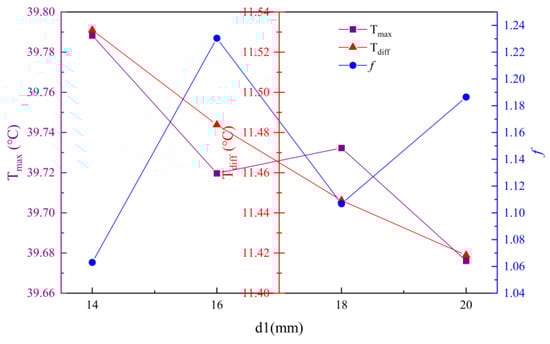 With d1 as the horizontal coordinate and k as the vertical coordinate, the trend of the influence of the disturbance structure spacing on each evaluation index can be obtained, as shown in Figure 16. The maximum temperature difference of the battery module gradually decreases as the spacing of the disturbance structure increases, because the larger spacing indicates that the disturbance structure is more uniformly distributed inside the mini-channel, and the plate can evenly dissipate the heat to improve the temperature uniformity. In addition, the maximum temperature and the friction factor show an opposite trend, which indicates that the two indexes are negatively correlated. In this section, the maximum temperature and the maximum temperature difference achieve the best value when d1 = 20 mm, and this value is selected as the final parameter, although the friction factor is not optimal. Here, the heat dissipation performance is considered first.