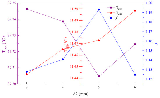 With d2 as the horizontal coordinate and k as the vertical coordinate, the trend of the influence of the disturbance structure length on each evaluation index can be obtained, as shown in Figure 17. As d2 increases, the maximum temperature difference gradually increases, which indicates that increasing the length is not conducive to temperature uniformity. Actually, increasing d2 means the distance between adjacent disturbance structures decreases, which is not conducive to the uniform distribution of the fluid, and the heat dissipation is better in the area where the disturbance structure exists. In addition, the maximum temperature and the friction factor show an opposite trend. On the one hand, increasing the length will cause the area of convective heat transfer inside the mini-channel to increase, thus improving the heat dissipation performance; on the other hand, increasing the length will disturb the original flow traces of the coolant, the velocity and pressure fields inside the mini-channel will change, and the coolant will diverge when it is close to the disturbance structure, so the frictional resistance inside the flow channel will also increase. However, when the length reaches 5 mm, increasing the length will cause the maximum temperature to rise, which indicates that when the disturbance structure is too long, the spacing will become too short, and the coolant will only flow from both sides of the disturbance structure. There will be a dead zone between the adjacent disturbance structures, and the friction factor will become smaller, but at the same time, the heat dissipation performance will be affected, and when the length is 5 mm, the enhanced heat transfer performance of the mini-channel liquid cooling plate is the best.