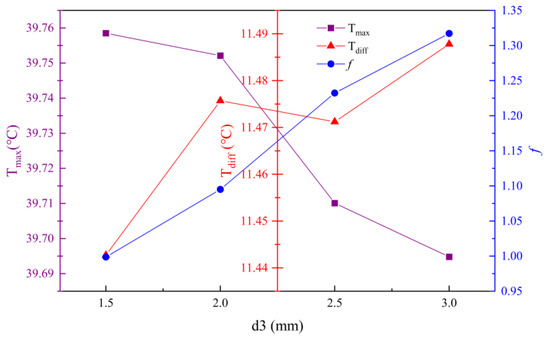 With d3 as the horizontal coordinate and k as the vertical coordinate, the trend of the influence of the disturbance structure width on each evaluation index can be obtained, as shown in Figure 18. As d3 increases, the maximum temperature decreases, but the friction factor gradually increases. On the one hand, increasing the width of the disturbance structure causes an increase in the convective heat transfer area inside the mini-channel; on the other hand, the disturbing effect on the fluid is enhanced, the stable flow field is abruptly changed, the boundary layer is generated in the middle region of the fluid, and the turbulence is enhanced. In addition, the overall trend of the maximum temperature difference is increasing, which indicates that increasing the width will cause the coolant to divert to both sides of the disturbance structure, and the coolant flow rate is lower in the area between adjacent disturbance structures, resulting in uneven distribution of coolant flow and preventing the battery surface from being uniformly dissipated, thus causing poor temperature uniformity.