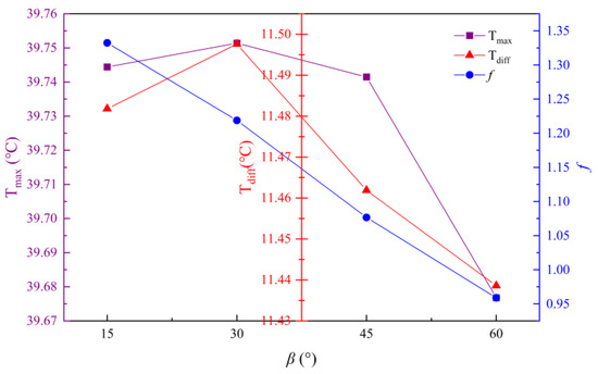 With β as the horizontal coordinate and k as the vertical coordinate, the trend of the influence of the disturbance structure width on each evaluation index can be obtained, as shown in Figure 19. The friction factor gradually decreases as β increases, which indicates that the coolant in the cavity is subject to less frictional resistance when flowing out of the cavity, which is more conducive to the natural flow of the fluid. However, the maximum temperature and the maximum temperature difference increase slightly and then decrease significantly when β increases to 30°, which indicates that the heat dissipation is the worst at this value. At this value, the coolant flow velocity is low at the opening angle of the cavity, and there is even a dead zone, so the coolant cannot flow evenly to dissipate heat. In addition, as shown in Table 5, the sensitivity of the friction factor to each evaluation index is the lowest among all factors, which indicates that it has the least influence on the enhanced heat transfer performance, and the thermal characteristics of the battery module and the performance of the flow channel are the best when the cavity opening angle is 60°.