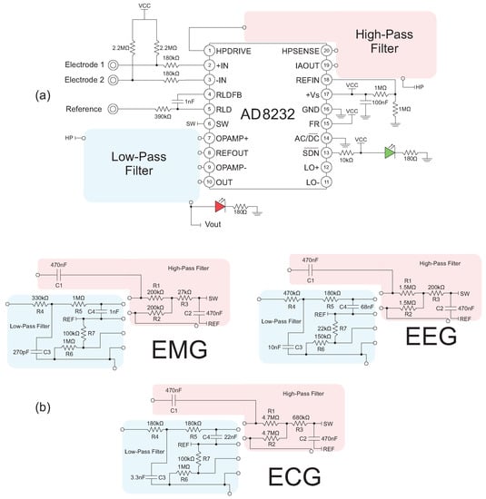 Schematic of the developed circuit. (a) A complete circuit schematic, with the components that are not changed during each biopotential design. The high-pass and low-pass filter placement are highlighted and detailed in (b) for the three chosen biopotentials.