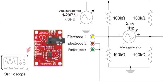 Firstly, the electrical parameters were extracted from the commercial module AD8232—Single Lead Heart Rate Monitor AD8232® [],—as this device has been used in several applications. Therefore, the electrical parameters of the proposed circuit were measured.