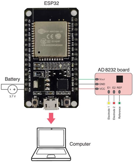 Thus, the biopotential signals were acquired using the three circuits. The circuit was supplied by batteries to isolate the volunteer from the main supply, and the signals were sent to a microcontroller ESP32 Devkit, as presented in Figure 3. This microcontroller acquired the data from the serial with a fixed sampling frequency (1 kHz for EMG and ECG and 1 Hz for EEG), which can acquire the selected biopotential by the Nyquist criterion. Moreover, the microcontroller has a 12-bit analog-digital converter resolution, which is suitable for biomedical signals. The data were acquired from a computer without connection with the main supply. The EMG signal was acquired from the biceps brachii muscle using differential electrodes connected to the inputs. The reference electrode was placed on the olecranon. The ECG circuit was tested by placing the electrodes in a Lead I configuration. Three disposable Ag/AgCl gel electrodes were used in both ECG and EMG.