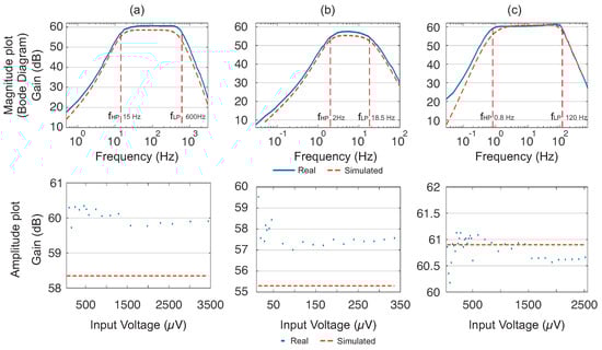 Magnitude plot from the Bode Diagram and obtained gains from the designed circuits for (a) EMG, (b) EEG, and (c) ECG biosignals. Both real and simulated values are presented. Filters’ low-pass and high-pass cutoff frequencies are highlighted. In (a,b), fHP and fLP are the high and low cutoff frequencies, respectively.