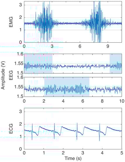 Some applications use the same module for ECG, EMG, and EEG acquisition [,,,], without changing the cutoff frequencies on the filter of gain adjustment for the parameters mentioned above. It is a crucial issue in biopotential circuit design. Moreover, even though these adaptations were performed (as presented in []), some tests were necessary to guarantee the gain and bandwidth for the required biopotential, assuring that the circuit matched for the purpose application. This is one of the problems of this type of application because, as the acquisition requirements are not met, the applications developed may suffer drops in their performance or be incorrectly met because the acquisition system is inadequate. Therefore, analyzing the electronic parameters of this type of system is necessary to guarantee that the circuits are suitable for acquiring biopotentials.